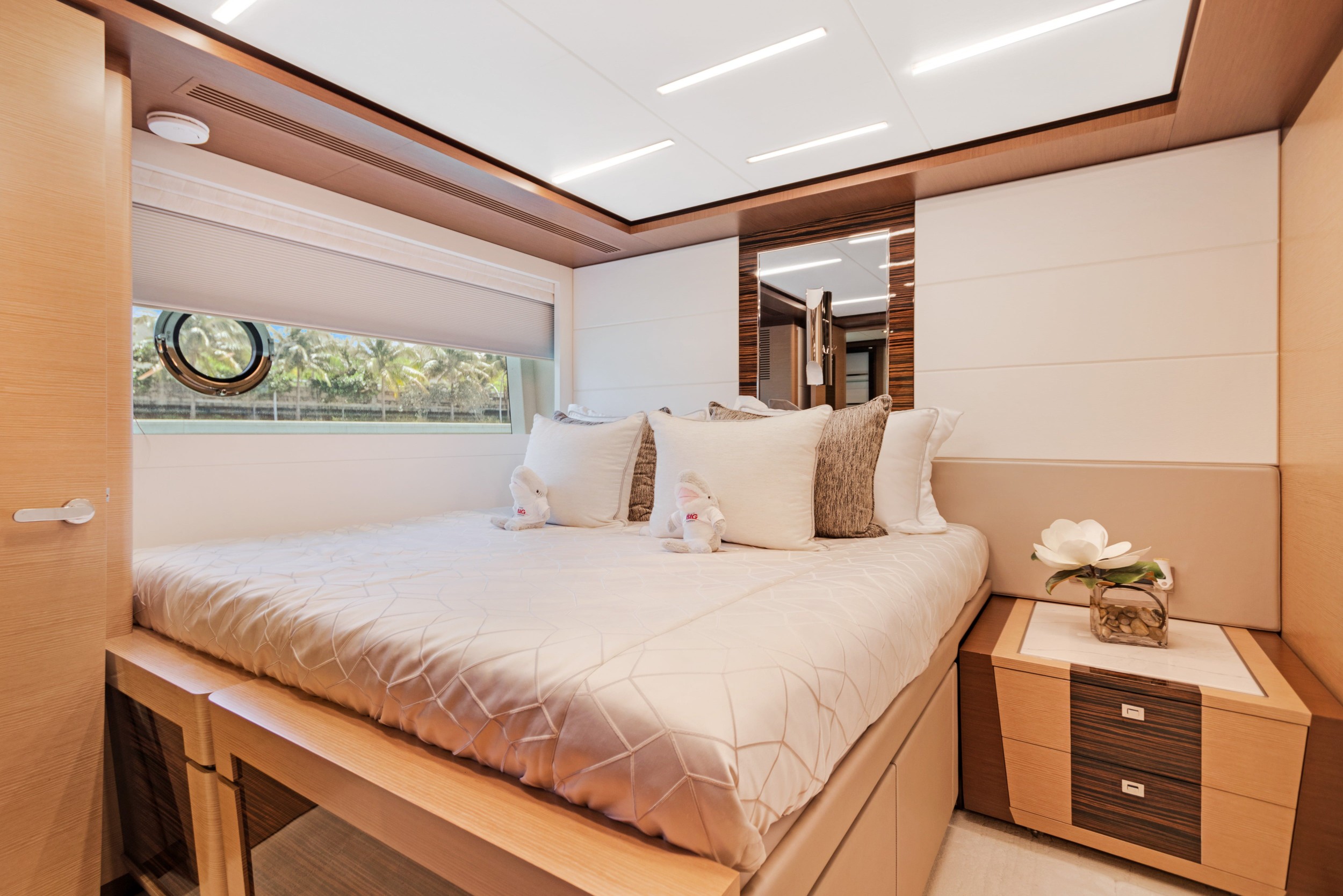 Inside, the yacht exudes refined sophistication with a spacious main salon featuring chic lounging and dining spaces, a custom barista bar, and a pop-up TV discreetly integrated into sleek furnishings. Luxurious upholstery, high-gloss finishes, and oversized windows create a bright, open atmosphere that invites socializing and relaxation alike. Every detail is crafted to deliver a charter experience defined by luxury, comfort, and style. sku#ypm12500igm© 1999 Miami Yacht Charters